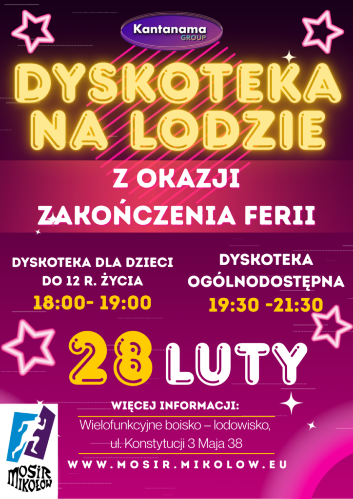 Informujemy, że Dyskoteka na Lodzie odbędzie się 28.02.2026 r. i będzie stanowić oficjalne zakończenie ferii zimowych.